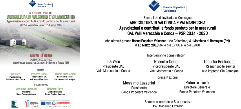 Il 15 marzo 2018, dalle 17 alle 19, verranno illustrate le opportunità offerta dal GAL per l’agricoltura in Valmarecchia e Valconca, presso la sede di Banca Popolare Valconca, a Morciano di Romagna.