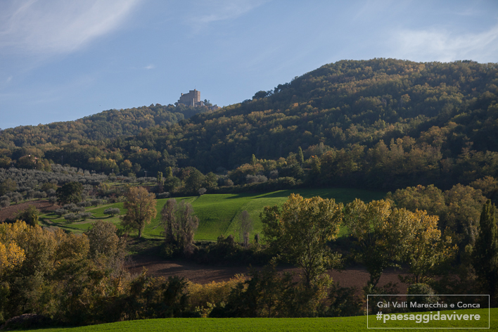 La vista della sua Rocca ruba lo sguardo, imponente manufatto malatestiano che svetta imprendibile sulla vallata del fiume Conca. Ma raggiunto il suo abitato di impronta medievale anch’esso affascina e invita a percorrerlo. E intorno un verde con boschi integri e campagne dolcemente coltivate si offre con generosità, mentre fa da sfondo la riviera, e il mare disegna l’orizzonte.